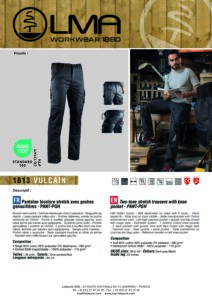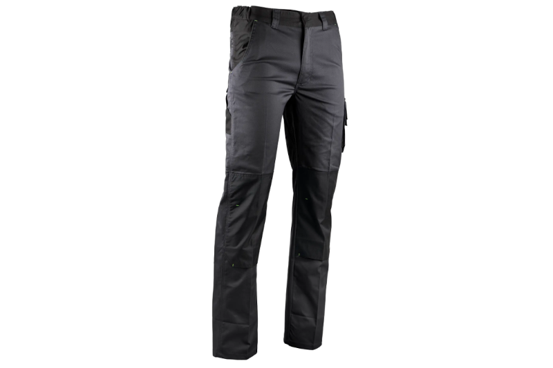 Pantalon bicolore stretch avec poches genouillères –  Bouton semi caché – Ceinture élastiquée côtés 5 passants – Braguette zip injecté – Large passant milieu dos – Poches italiennes, entrée de poche renforcée en Oxford – Poche à soufflet, plaquée cuisse gauche, avec rabat fermé par bande auto-agrippante – Système porte outils – Poches