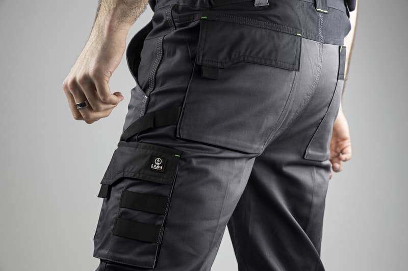 Poche mètre + surpoche – Triple surpiqûre fourches et côtés de jambe – Transfert rétro-réfléchissant sur genouillère gauche