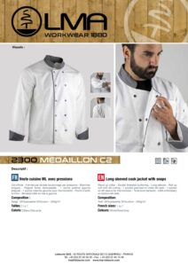 Veste cuisine MANCHES LONGUES avec pressions – Col officier – Fermée par double boutonnage par pressions – Poignet fendu retroussable – 1 poche poitrine gauche plaquée – 1 poche manche gauche pour thermomètre – Points d’arrêt ton/ton – Broderie LMA en bas à gauche