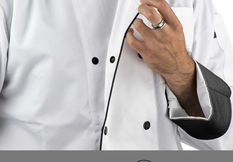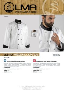 Veste cuisine MANCHES LONGUES avec pressions – Col officier – Fermée par double boutonnage par pressions – Poignet fendu retroussable – 1 poche poitrine gauche plaquée – 1 poche manche gauche pour thermomètre – Points d’arrêt ton/ton – Broderie LMA en bas à gauche